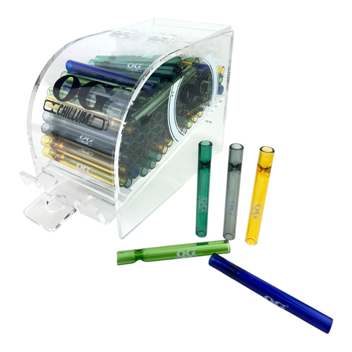 This display with a 100 pieces of OG Glass Chillum is the ideal product for your smoke shop. Simply stock it up and watch it fly off the shelves. These glass chillums are made with really thick and heavy duty borosilicate glass. The thickness is enough to keep the heat as cooled while you're smoking.