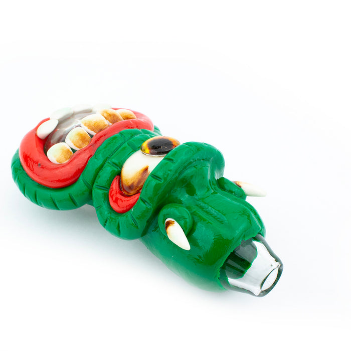 The 5" 3D Monster Hand Pipe is a unique and fun smoking accessory. It features a 3D sculpted monster with an eyeball and teeth, and some variations may include horns for added character. Each hand pipe comes in assorted colors of monsters, including green with red monster, yellow and green, or a mix of yellow, green, and red.