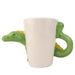 This novelty mug is made from ceramic. It features a cool look in classic pastel Dinosaur colors. The Dinosaur has its body wrapped around the mug followed by the spikes at the top of the body. The tail is as the handle and mouth piece.