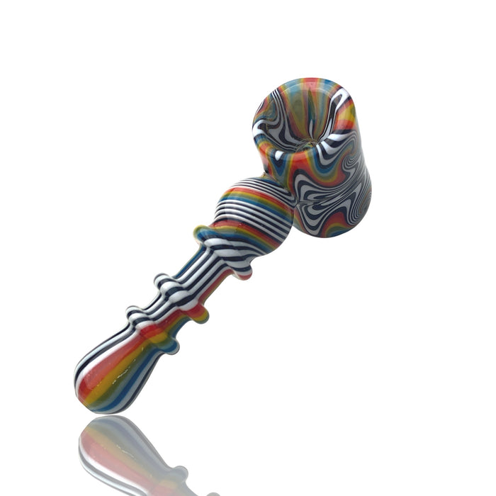 The Stokes Hippie Glass Bubbler is handcrafted from borosilicate glass and decorated with an intricate rainbow mixed with black wig wag design throughout the bowl and handle. On the side of the bubbler, you'll find a trusty carb hole that will allow your hits to be effective, and quick to the draw. Features a beautiful shape measuring at 5” length x 2.3” Height with a weight of 85g. This Heady bubbler features a wide, deep bucket to allow you to pack and load your favorite dry herb for the superior smoking experience.
